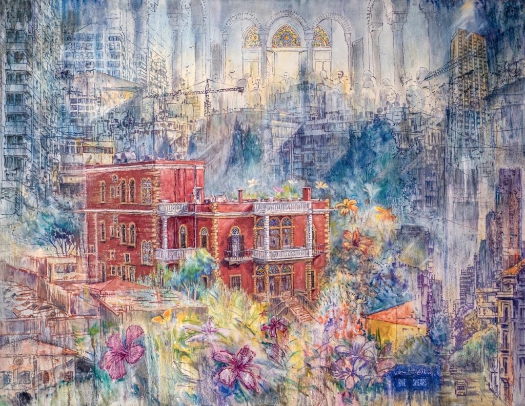 “I called my exhibition BE/Longing because it has a sense of identity through place. I’m interested in the exploration of memory and hidden stories, these magical stories that live on in these amazing old buildings in Beirut. And many of them have been forgotten. So I explore how we find this sense of belonging and identity through stories and memories. And in the exhibition you’ll see I’ve painted certain buildings and iconic places that have hosted major events in Lebanese history.
