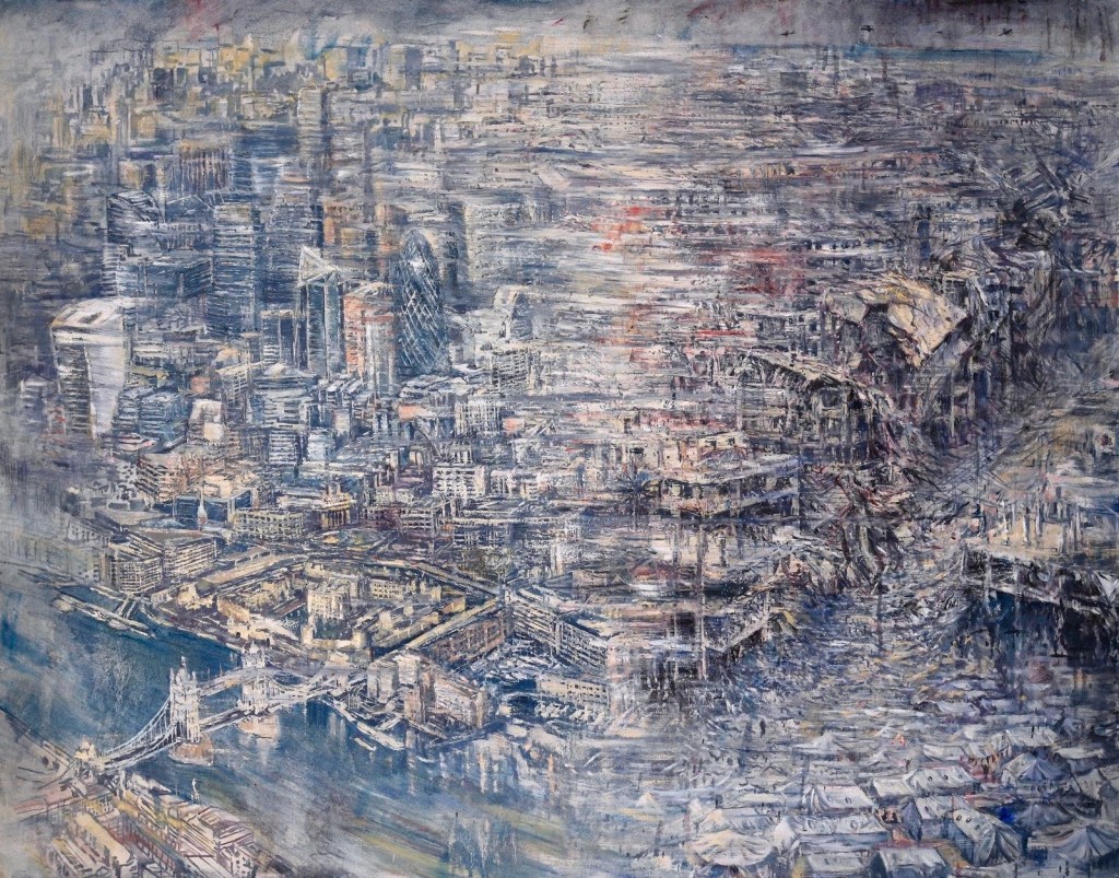 On the left you have the business district of the city of London, where all the money is made, laundered, invested…you know it’s where the money flows. And then on the right of the painting you have that merging into the destruction in Gaza, and the refugee tents in Rafah. I actually have a friend in Gaza at the moment who’s sending me updates and photographs. So some of the imagery in this painting is from my friend. And the imagery of the city of London is taken from photographs by my Lebanese friend in London.