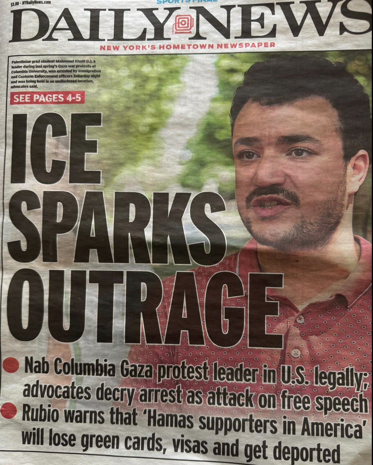 This is my friend Mahmoud Khalil. On March 8, he was taken by Immigration and Customs Enforcement (ICE) agents from his residential apartment on Columbia University campus in New York City. The agents did not give Mahmoud a reason for his arrest; nor did they read him his rights, or even have an arrest warrant. They did not pay any heed to the fact that Mahmoud has a greencard and is a lawful permanent US resident. Mahmoud’s wife Noor was with him at the time of his arrest. She was 8 months pregnant.