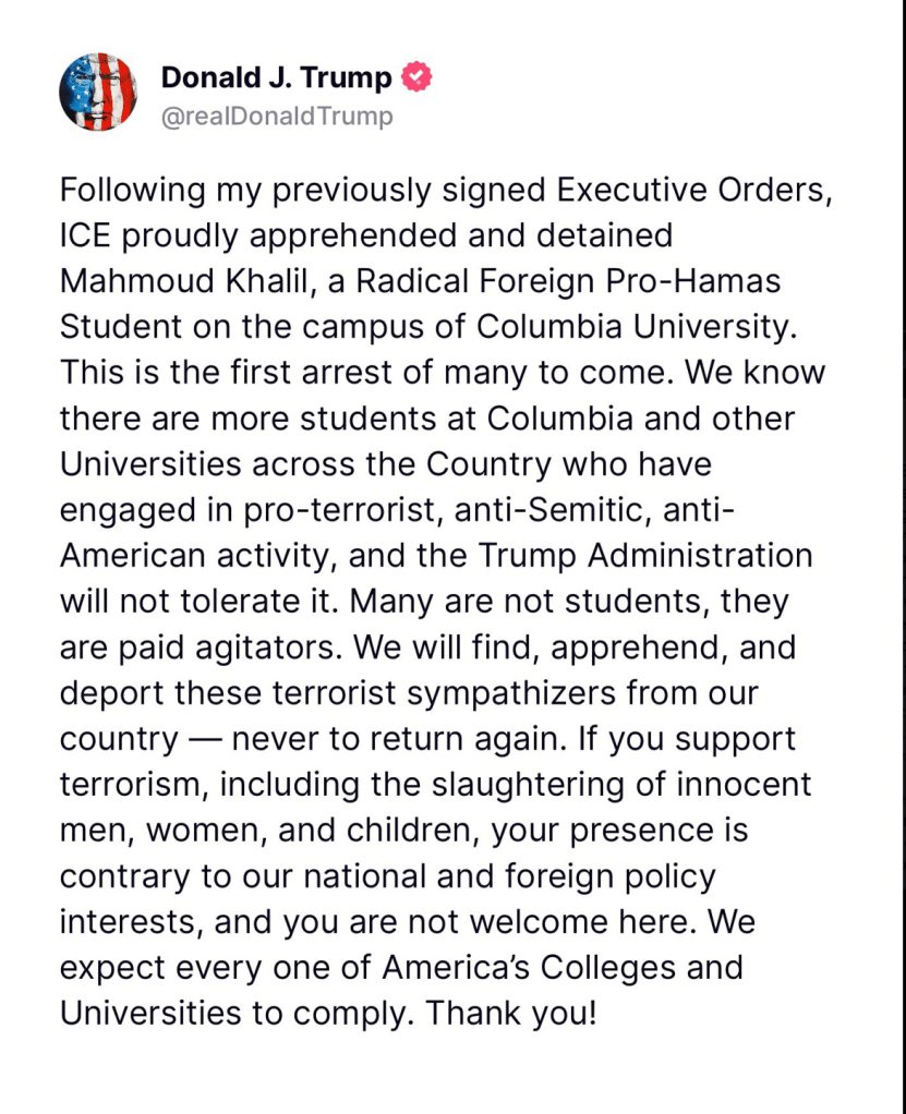 “The Trump administration is targeting me as part of a broader strategy to suppress dissent. Visa-holders, green-card carriers, and citizens alike will all be targeted for their political beliefs. In the weeks ahead, students, advocates, and elected officials must unite to defend the right to protest for Palestine. At stake are not just our voices, but the fundamental civil liberties of all.”