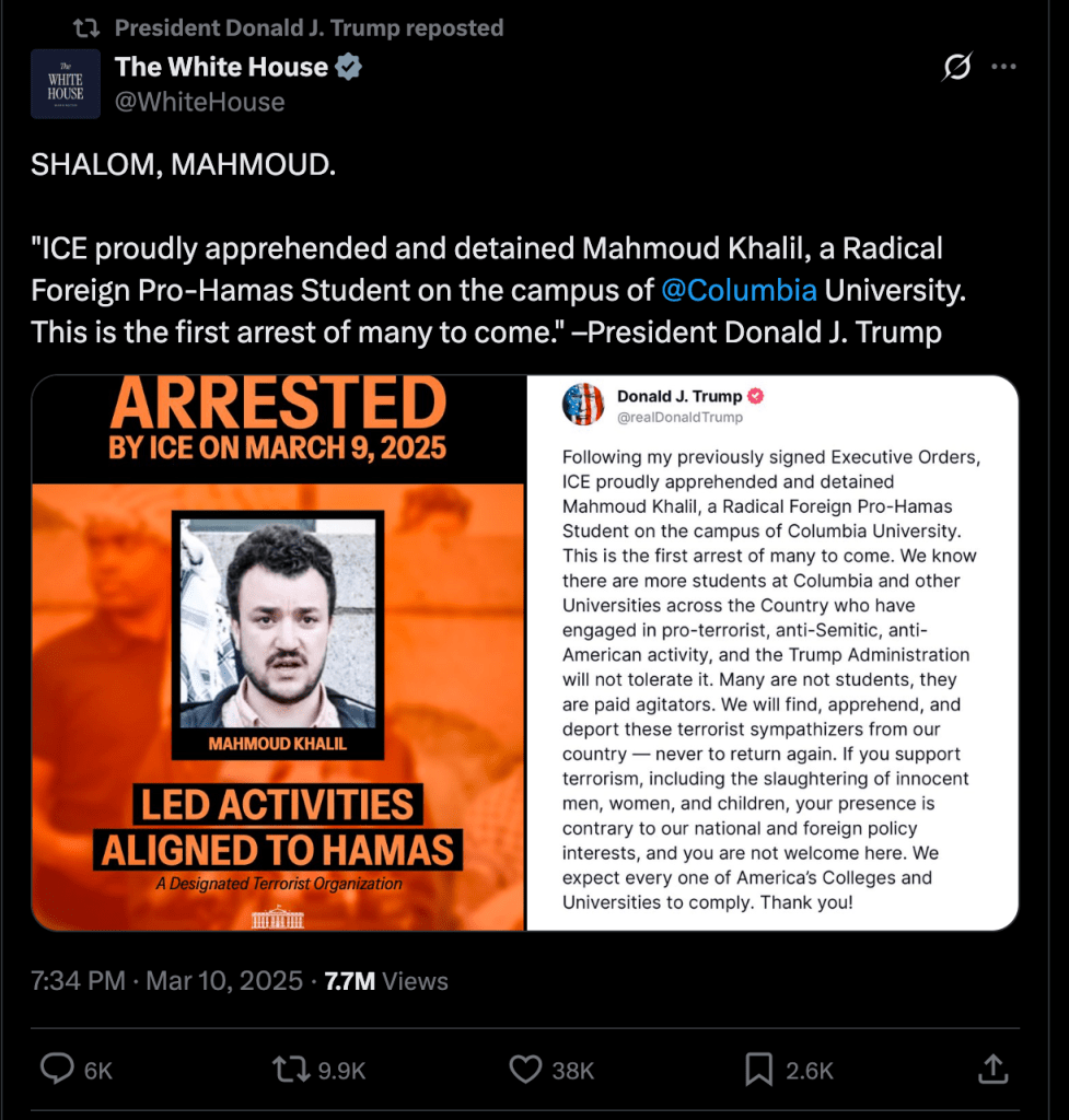 Mahmoud’s case is also part of a broader, targeted attack by the White House on universities. On March 7, the day before Mahmoud’s arrest, the administration announced it would be withdrawing approximately $400 million in federal funding and contracts from Columbia University, citing “continued inaction in the face of persistent harassment of Jewish students.” Six days later, on March 13, the administration sent a letter to Columbia’s officials, outlining nine demands. These included the creation of an internal security force with the power to remove or arrest individuals from campus; the adoption of a definition of antisemitism that conflates criticism of Zionist policies with antisemitism; and the surrendering of oversight of the Middle Eastern, South Asian, and African Studies Department. Columbia University capitulated to the demands, but as of now, the $400 million in funding has not been restored. In the weeks since, at least 13 other elite universities across the U.S. have been targeted with similar funding cuts or threats.